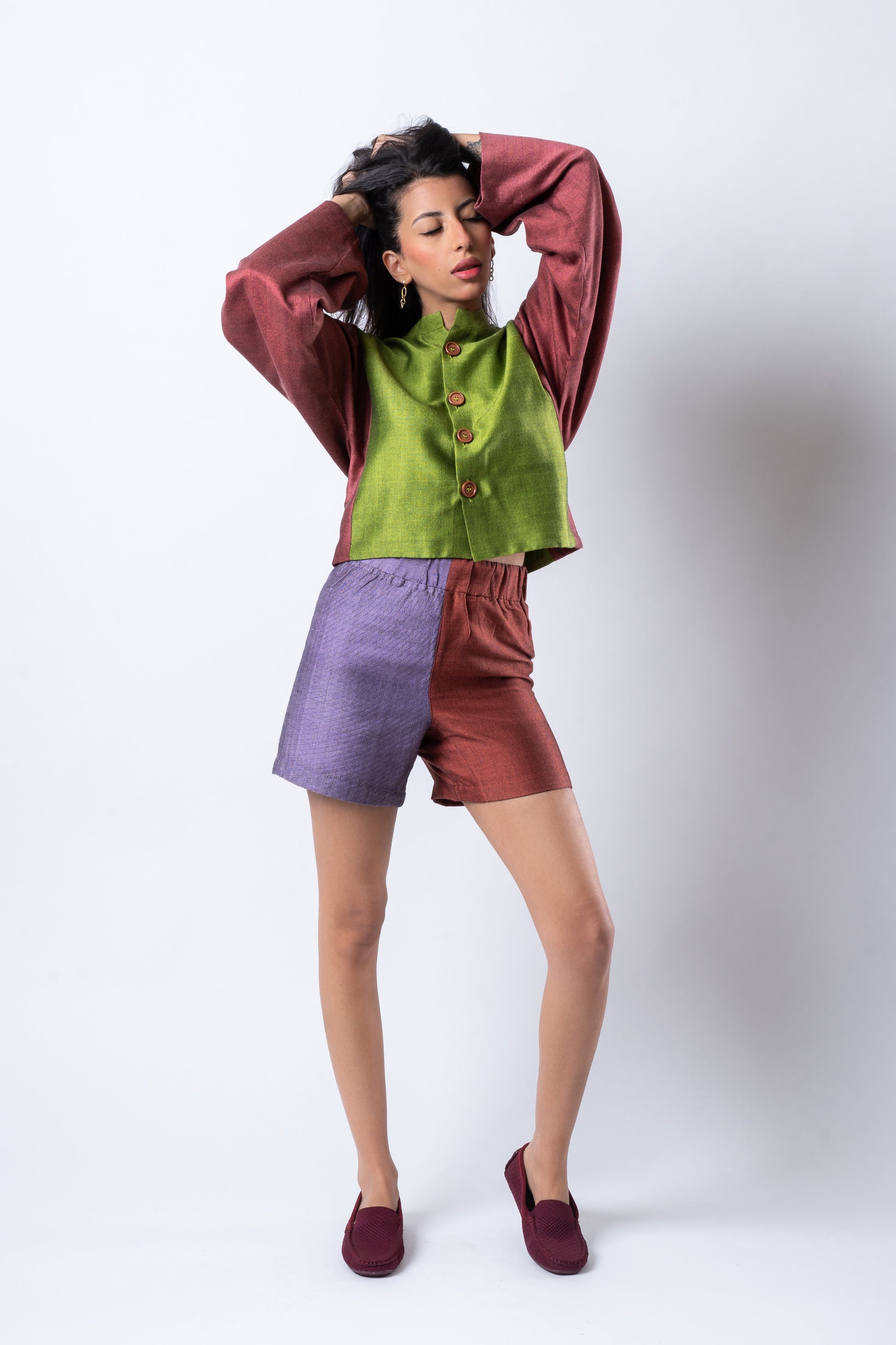One side quilted, color-blocked, Lavender and Saffron regular fit shorts
