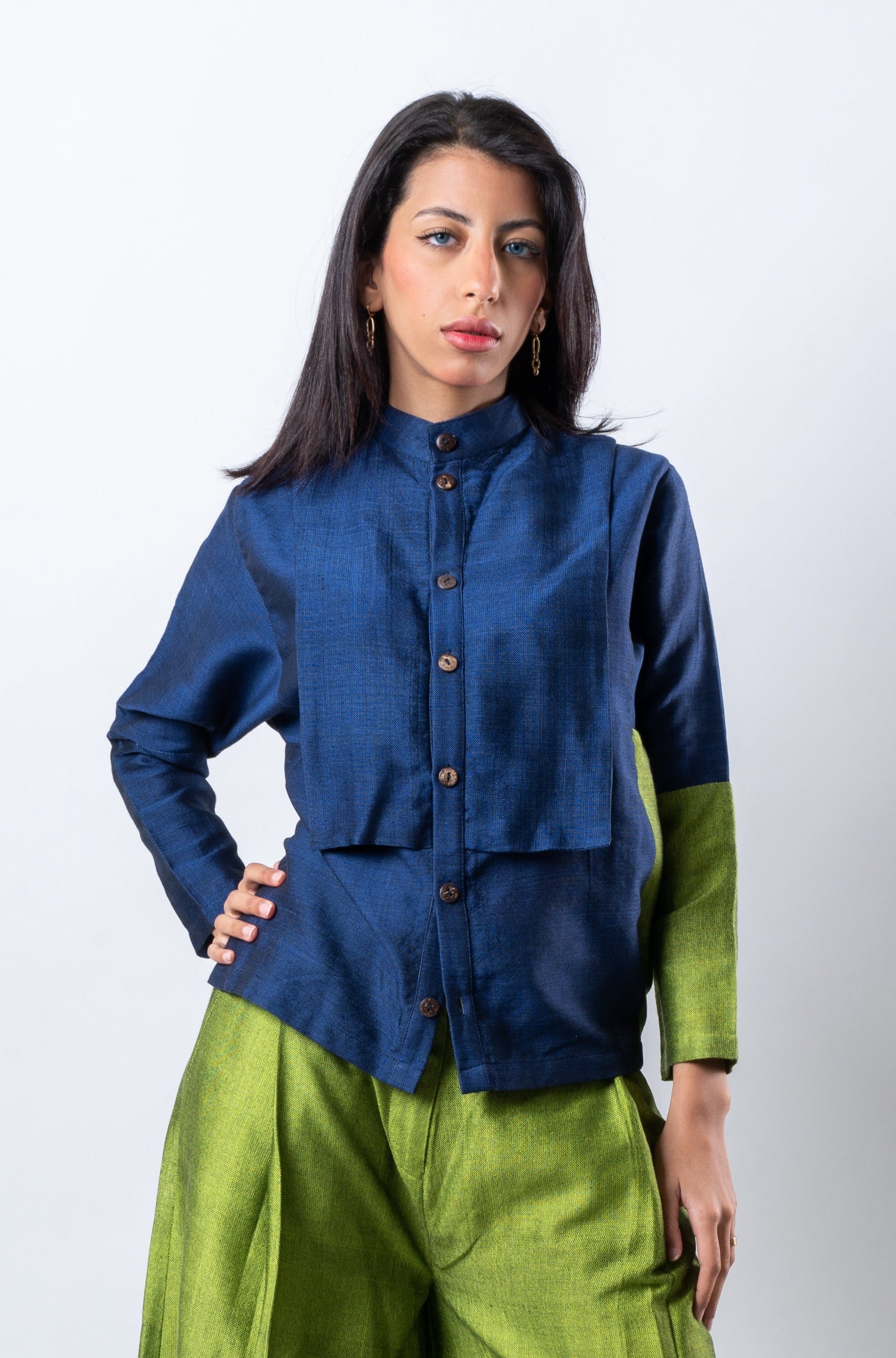 Regular fit shirt with extended sailor collar and multiple panels in Neon and Night Blue