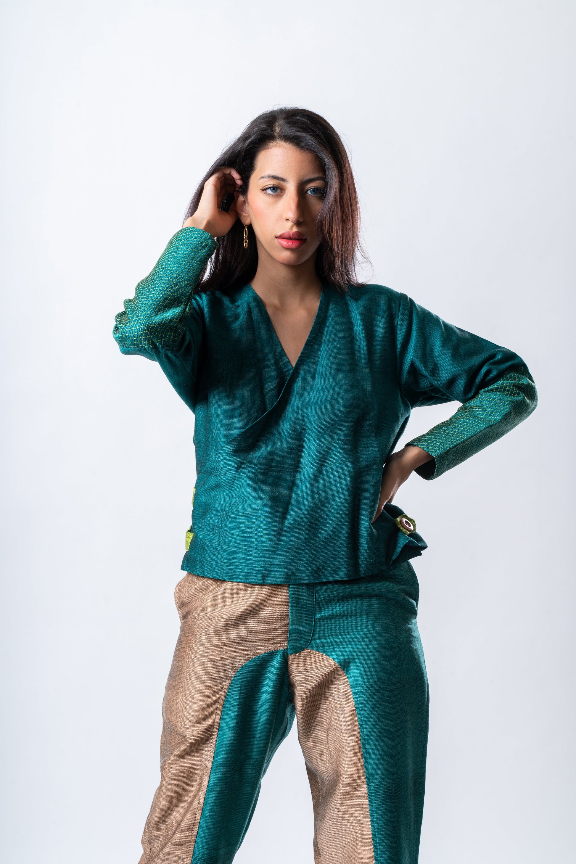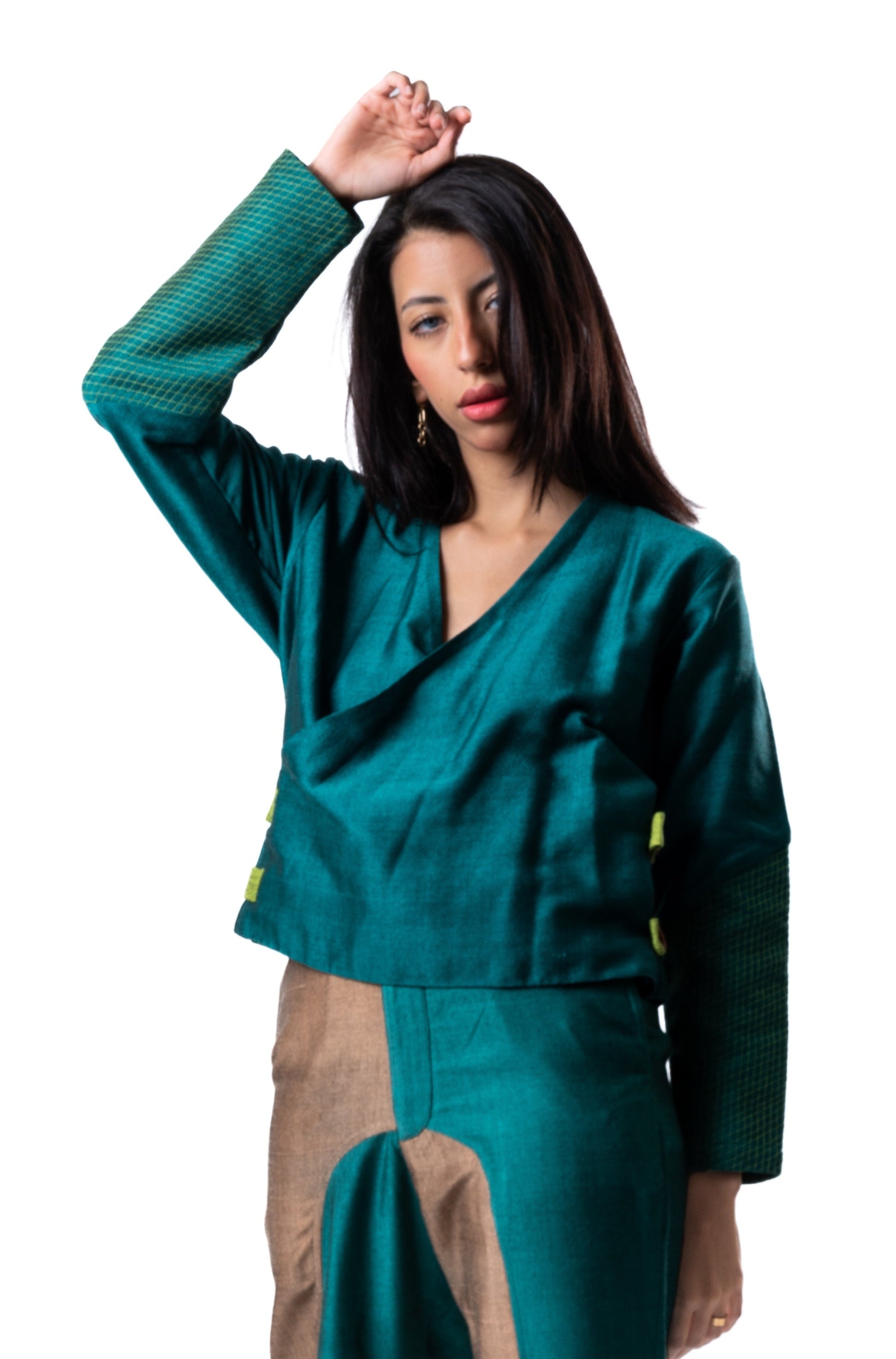 Versatile wrap shirt in Emerald with intricate quilted sleeves and adjustable straps in Neon